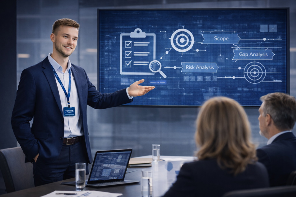 Rakendamine algab reaalse olukorra kaardistamisest. Hindame, millised teenused, protsessid, infosüsteemid ja varadkuuluvad ISMS-i ulatusse ning milline on organisatsiooni tegelik küpsus võrreldes ISO 27001 ja E-ITS nõuetega.